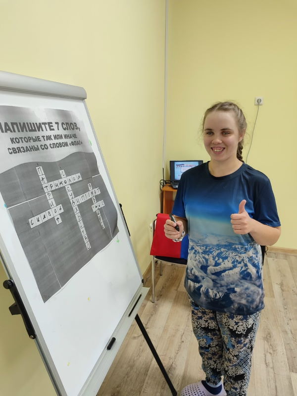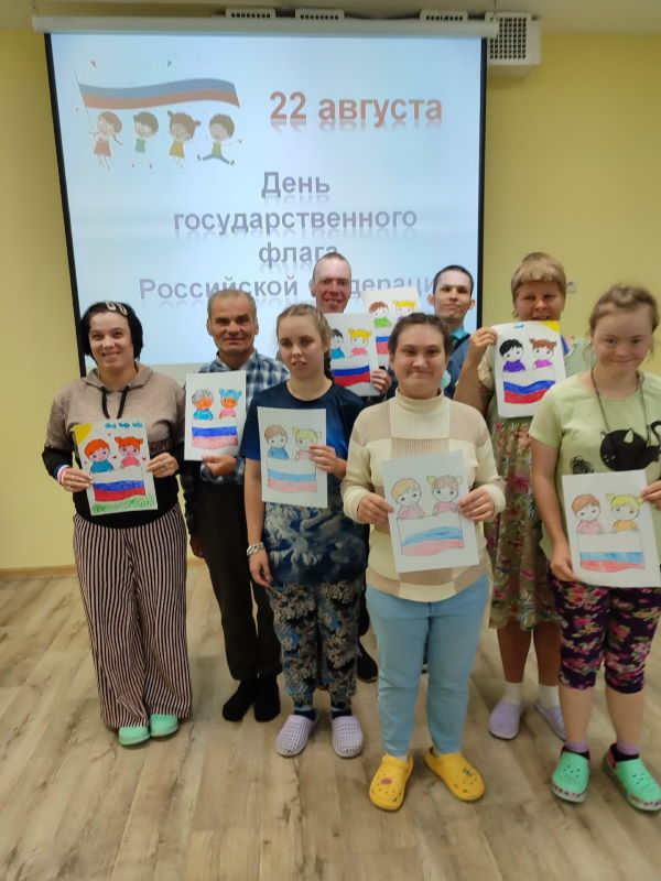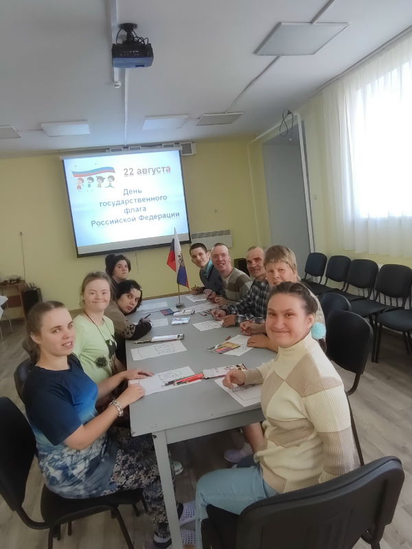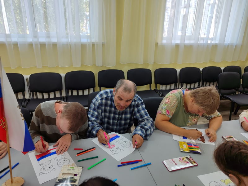 В рамках Дня государственного флага России музыкальный руководитель Анастасия Валерьевна провела познавательный час для получателей социальных услуг «Флаг моего государства». Открыли мероприятие песней Дениса Майданова «Флаг моего государства». Анастасия Валерьевна рассказала об истории государственных символов России, о значении каждого цвета флага и его значении в жизни каждого гражданина. Участники мероприятия ответили на вопросы интеллектуальной игры «Флаг России», выполнили рисунки в честь праздника Российского флага.