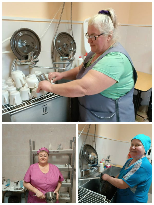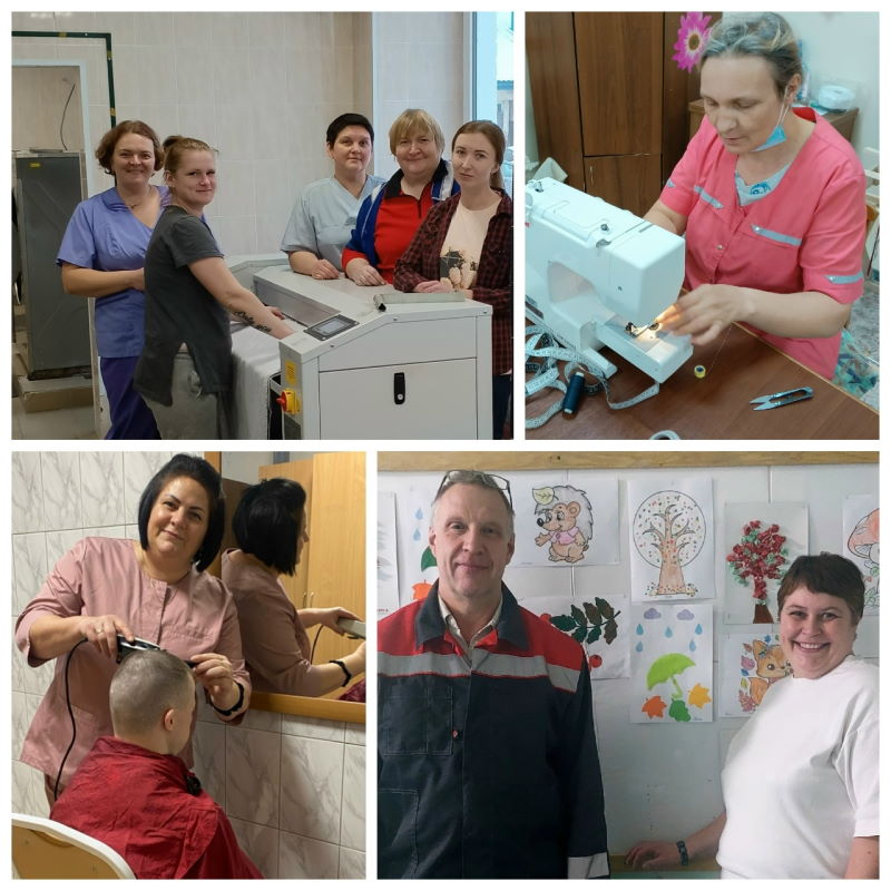 Каждый день они убирают десятки помещений и прилегающую территорию, зимой расчищают дорожки от снега, летом – поддерживают порядок в зонах отдыха и прогулок. В прачечной стирают и гладят бельё, в швейной ремонтируют и подшивают одежду, чтобы каждый ребёнок и взрослый был аккуратно одет. Парикмахер бережно и терпеливо стрижёт даже самых тревожных воспитанников. Буфетчицы накрывают готовую пищу - аккуратно, по расписанию, с учетом пожеланий и особенностей питания детей и взрослых, следят за чистотой: всё сияет – от кружек до подносов.